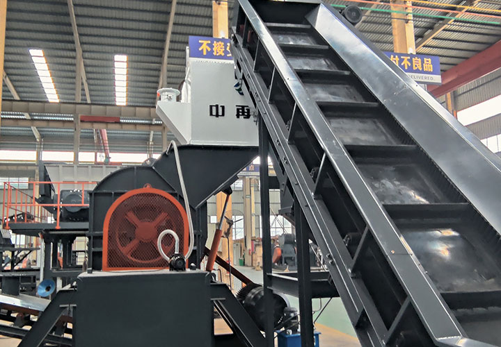 破碎線主機(jī)殼體采用特厚鋼板制造,內(nèi)襯為高錳鑄鋼件,可更換;主機(jī)轉(zhuǎn)子盤(pán)安裝于水平軸上,轉(zhuǎn)子盤(pán)圓周分布有銷軸,軸向懸有錘頭;主軸用滾珠軸承支撐,循環(huán)油強(qiáng)制潤(rùn)滑冷卻,并裝有溫度傳感器;進(jìn)料口裝有液壓輥筒喂料裝置,位置一高一低,同向旋轉(zhuǎn),能將大件松散物料壓扁,送入破碎腔內(nèi)。