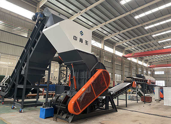 破碎線主機殼體采用特厚鋼板制造,內(nèi)襯為高錳鑄鋼件,可更換;主機轉(zhuǎn)子盤安裝于水平軸上,轉(zhuǎn)子盤圓周分布有銷軸,軸向懸有錘頭;主軸用滾珠軸承支撐,循環(huán)油強制潤滑冷卻,并裝有溫度傳感器;進料口裝有液壓輥筒喂料裝置,位置一高一低,同向旋轉(zhuǎn),能將大件松散物料壓扁,送入破碎腔內(nèi)。