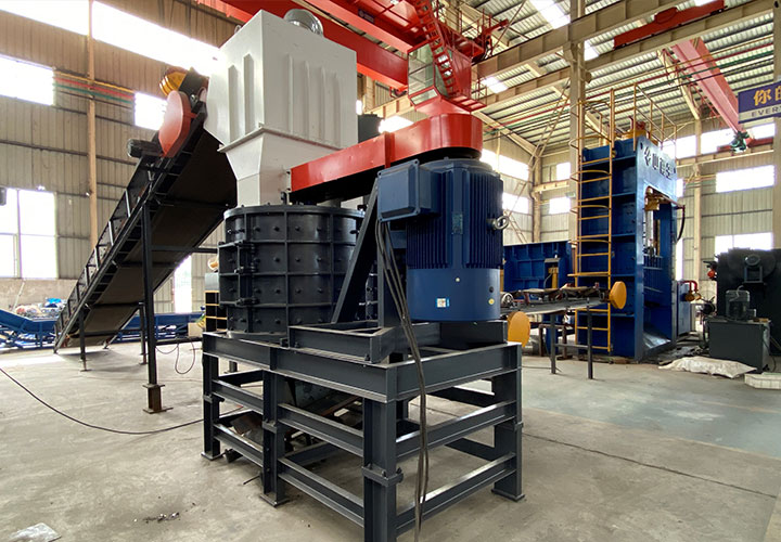 破碎線主機(jī)殼體采用特厚鋼板制造,內(nèi)襯為高錳鑄鋼件,可更換;主機(jī)轉(zhuǎn)子盤安裝于水平軸上,轉(zhuǎn)子盤圓周分布有銷軸,軸向懸有錘頭;主軸用滾珠軸承支撐,循環(huán)油強(qiáng)制潤滑冷卻,并裝有溫度傳感器;進(jìn)料口裝有液壓輥筒喂料裝置,位置一高一低,同向旋轉(zhuǎn),能將大件松散物料壓扁,送入破碎腔內(nèi)。